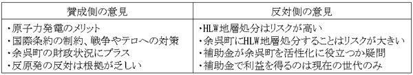 そこで前節に述べたHLW地層処分問題の社会啓発用Websiteを、滋賀県立膳所高校の生徒諸君16名に予め閲覧して貰い、滋賀県で実際にあった時事問題(滋賀県余呉町の町長が)HLW地層処分場の調査候補地として2005年12月に名乗りを上げようとしたが、滋賀県知事および地域住民の反対にあった取り下げた事件)を題材に、「余呉町はHLW地層処分場を誘致すべきである。是か否か」をテーマに、2008年4月28日にDEEVによりデイベートを行って貰った。生徒諸君がデイベートで上げた代表的な賛成、反対の意見は、表1のようなものであった。