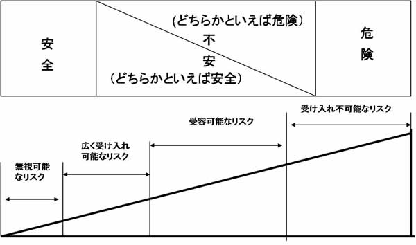 人々が抱く安全と危険の間にはギャップがある.万人が安全と見なす領域と,逆に万人が危険と見なす領域には図1の上部に示すように不安な領域がある.また心理的なリスク認知は人によって異なる.この人によって異なる不安の程度をどのように取り扱うかが大きな問題である.しかしここでは心理的な問題には立ち入らず,絶対安全をリスクがゼロ,絶対危険がリスクが1と考え,図1の下部に示すように,安全の左側から危険の右側までリスクは直線的に上昇すると仮定する.そして,図の左から右の方向に大別して,(i) 無視可能なリスク,(ii) 広く受け入れ可能なリスク,(iii) 受容可能なリスク,(iv) 受け入れ不可能なリスクに線引きができると考える.