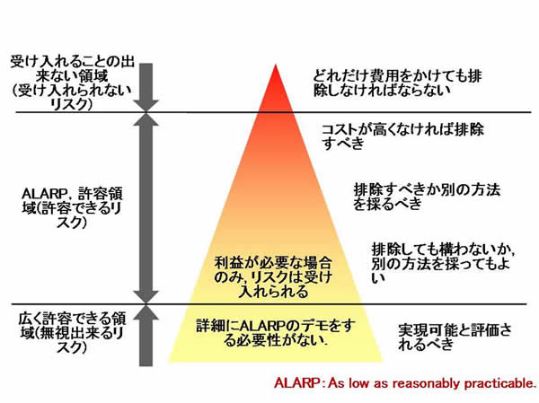 このようなリスク受容の線引きの実例として,国際放射線防護委員会(ICRP)による許容可能な放射線被曝量の勧告が有名である.そこでは図2に示すようなALARP(as low as reasonably practicable)と称する概念で線引き基準が議論されている.