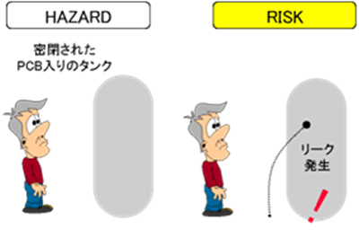 リスクアセスメントの用語の「ハザード」と「リスク」の意味の違いについて,図5を用いて説明する.ポリ塩化ビフェニールは工業化学で大量使用される化学原料であるが,これが人体の皮膚にかかると炎症を起こす危険化学物質である.図5ではこのポリ塩化ビフェニール入り密閉タンクをハザードとしている.ポリ塩化ビフェニールは危険源であるがタンクが健全である限り,人に危険な状態にはならない.しかしタンクがひび割れするとそこからポリ塩化ビフェニールが洩れ出ると危険事象であり,人がタンクのそばにいればその人は災害に遭遇する.これがリスクである.
