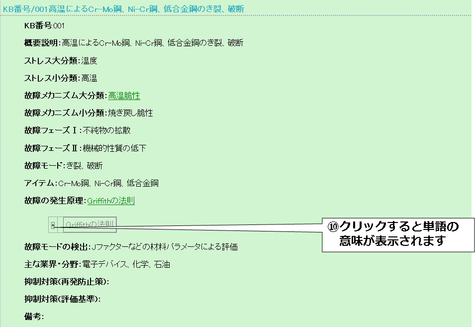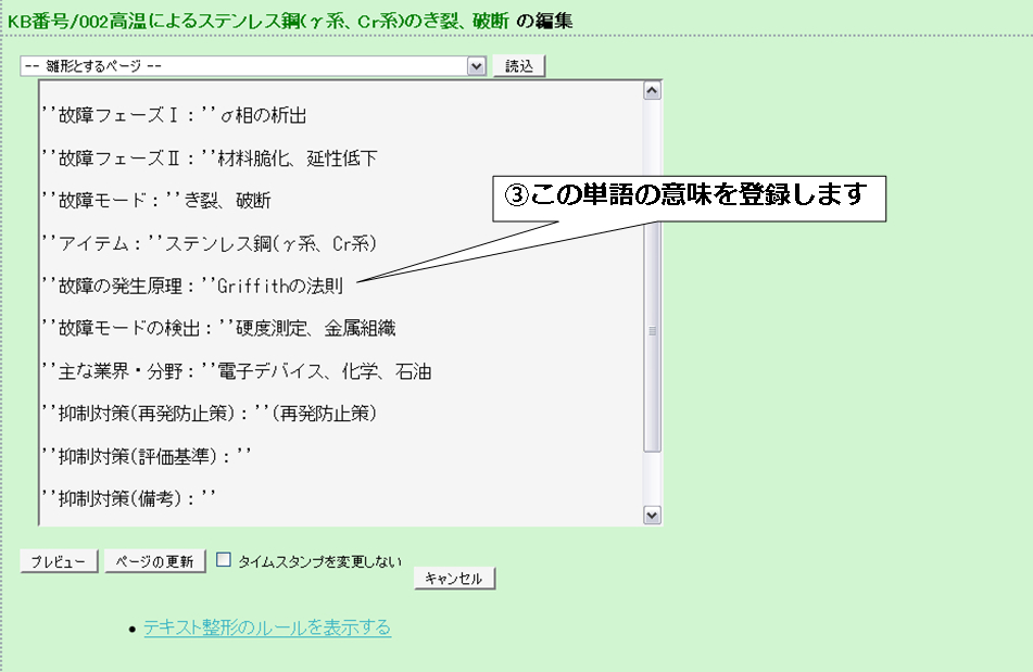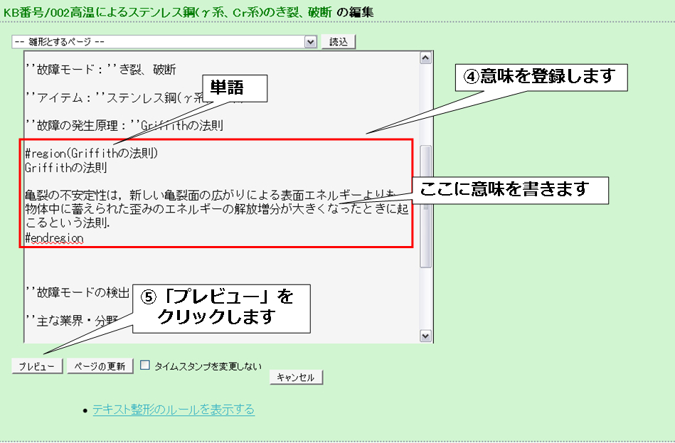 次に用語の意味を登録します。 ここでは「Griffithの法則」の意味を登録します。