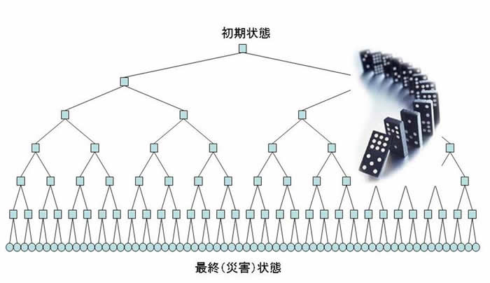 ②本来原因と結果を結ぶシナリオは無数に考えられる.そのような無数のシナリオのいずれかが進行しているのが現実である.そこで何かがきっかけで事象の進展がドミノ倒しのように一気に拡大して事故に至るという考え方が図7に示したものである.これは①と似ているが,特定の正常シナリオからの偏移でシナリオを考えるのでなく,あらゆる可能性を想定しようとする網羅性を意識する考え方である.