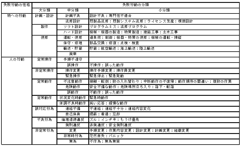 「失敗学」とは,文字通り「失敗に学ぶ」である.失敗学会の発足者である畑村の命名である.この学会では産業災害の実例を収集し,失敗知識の3つの曼荼羅という独特の形式で表現して「失敗知識データベース」をインタネット公開している.8)失敗学では,産業災害はすべてヒューマンエラーだとして,その原因,行動,結果について,真言密教の曼荼羅になぞらえた分類を図示する.9)なお,失敗曼荼羅というが,とくにこれを壁に掛けて瞑想し修行すれば悟りに到るものではない.通常の表形式にすれは 表1-4(a),(b)(c)になる.要するに原因(a),行動(b)および結果(c)においていずれも3層の階層構造に分類したものである.それぞれの失敗事例で,(a)表の項目のいずれかかが原因で,人の行動としては(b)表のいずれかが該当して,結果としては(b)表のいずれかがもたらされた,という形で知識として集積し,これをもとに災害を防止するための教訓を引き出す,というものである.とくに起こった失敗事例の分析には,3現(現地,現物,現人)主義で当該学会員が災害後の早めに出前で現場に赴き,第3者の立場で失敗事例を分析し,分類して失敗知識データベースに登録し公開する,という社会貢献活動であるのが特徴である.またこの活動で3現主義が活かされるためには,事業組織そのものが学会という第3者との協同の価値を認めて協力することが活動の成否を握っている.