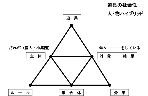 活動理論では,活動の構造を図10のように捉える.そこでは一見個人の行動に見えるものを集合体の活動の一部として把握する.また個人プレイに見えるものをチームプレイの一部として把握する.~図10の意味は,次のとおりである.主体(個人・小集団)は対象に働きかけて結果を得る.主体は集合体(集団)の中で行動する.そこでは集団のルールが作られ,集団の中で分業を図る.また分業で対象に働きかける際に,道具を用いる.道具とは物だけではない.制度のようなソフトも含まれる.