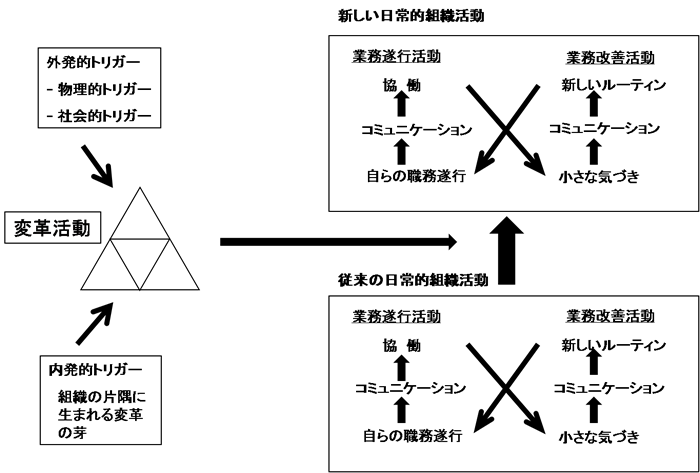 その契機(トリガー)は集合体にとって外発的な場合も,内発的な場合もありうる.杉万によれば図9のシングルループ改善学習に対応するものとして,日常的組織活動としての業務遂行活動(コミュニケーションや協働のあり方)の工夫改善,業務改善活動(日常ルーチン活動での小さな気づきをコミュニケーションで新たなルーチンとして定着化)として捉え,一方でダブルループの探索的学習として変革活動(従来の活動では想定しなかった新しい前提に立つ活動)を位置づけている.2)