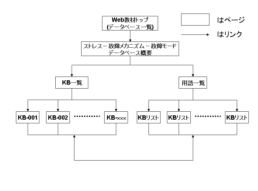 Web教材トップにあるデータベースリストかデータベース概要にアクセスできます。またデータベース概要からはKB(Knowledge Base)一覧、用語一覧にアクセスできます。KB一覧からは各KBにアクセスでき、各KBおよび用語一覧からは共通する用語を含むKBのリスト、KBリストにアクセスできます。