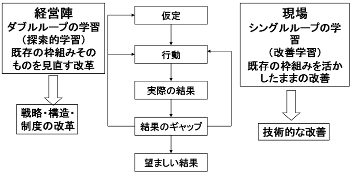 高野は組織の安全文化を高める4つの視点をコミットメント,コミュニケーション,モチベーション,アウエアネスを上げている.10)そして組織の成員を経営層,管理層,従業員層に階層化して,それぞれのレベルにおける4つの視点での安全文化を高める活動を表5のように例示している.~ そこでこの表のような各レベルでの安全文化向上のための取り組みをどのように組織で展開すればよいのか.これが図9に示すような二重ループの組織学習である(図9では表5中の管理層,従業員層を現場に一括している).現場は既存の枠組みを活かしたままの改善運動でシングルループの学習であり,主に現場に密着した技術的な改善である.一方,経営陣は既存の枠組みそのものを見直す改革でダブルループの探索的学習である.主に戦略・構造・制度の改革である.